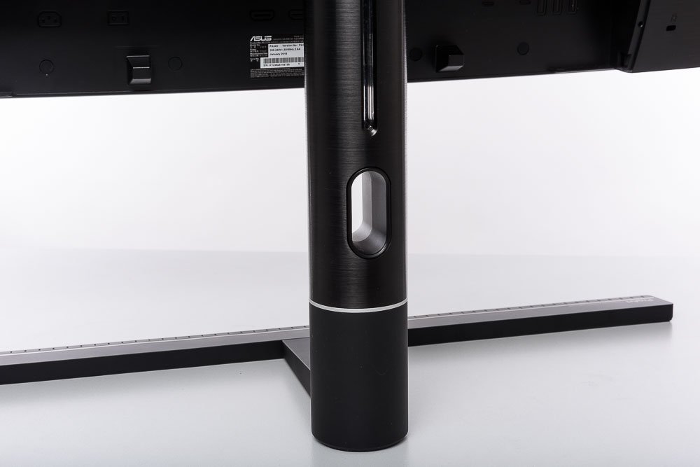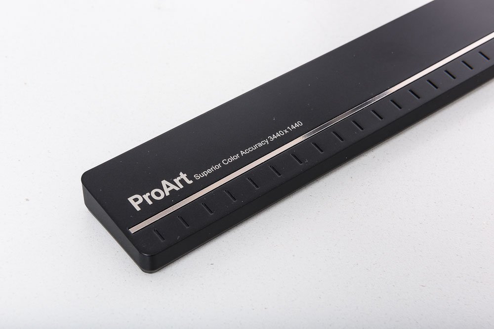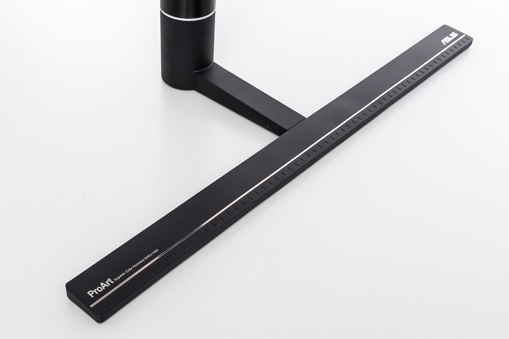 Lediglich der Lineal-artige vordere Teil des Standfußes mit seinem silbernen Zierstreifen ist mit Kunststoff ummantelt. Die Lineal-artige Rasterung soll sicher Präzision vermitteln, dient aber nur der Zierde. Auf jeden Fall kann man an vielen Stellen die bei den ProArt-Geräten übliche Liebe zum Detail beim Design erkennen.