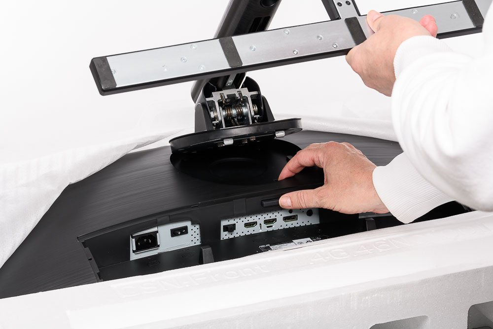 Misst man Wertigkeit in Gewicht, kann der PA34VC bereits vor dem Auspacken ordentlich punkten. Der Karton ist nicht nur riesig, sondern auch schwer. Sofern man die Anleitung von ASUS zur richtigen Entnahme aus dem Karton verstanden hat, ist der Aufbau sehr leicht. Aufgrund der Wölbung sollte man das Display zusammen mit seinem Styropor-Formteil aus dem Karton nehmen. Dann entstehen auch bei der Montage des Standbeins keine einseitigen Spannungen bzw. Druckbelastungen am Display.