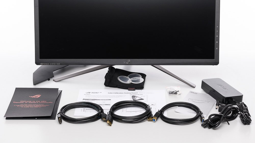 Immerhin fällt der Preisklasse angemessen auch der Lieferumfang großzügig aus. Neben dem obligatorischen Netzteil sind hochwertige Kabel für DP, HDMI und USB-3.0-Hub enthalten. Im Hintergrund sieht man eine spezielle Abdeckung für die Anschlüsse.