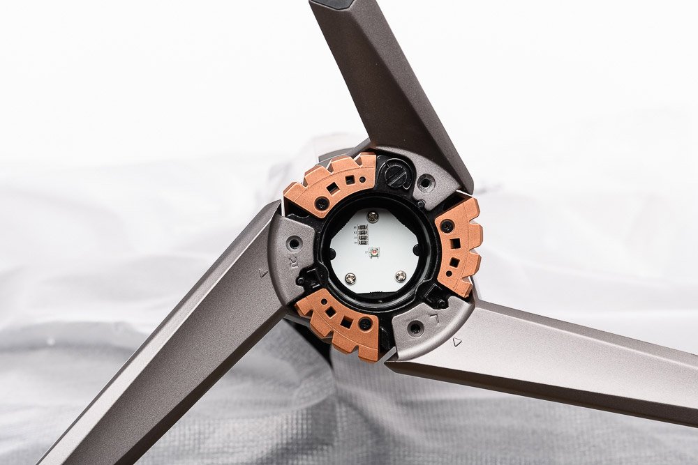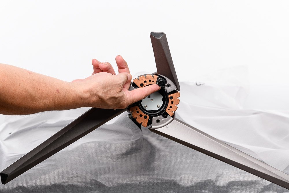 Ob die Schrauben versehentlich in einer anderen Redaktion entfernt wurden oder das Gerät ab Werk so geliefert wird, können wir nicht sagen. Im Handbuch ist das jedenfalls nirgendwo erwähnt und kann auf den ersten Blick leicht übersehen werden. Fehlen die drei Schrauben, mag das Standbein zunächst noch stabil wirken. Die drei „Stelzen“ des Standbeins sind dann aber nicht wirklich fixiert und können sich lösen. Bei einem Gerät für 2.500 EUR ein teurer Spaß.
