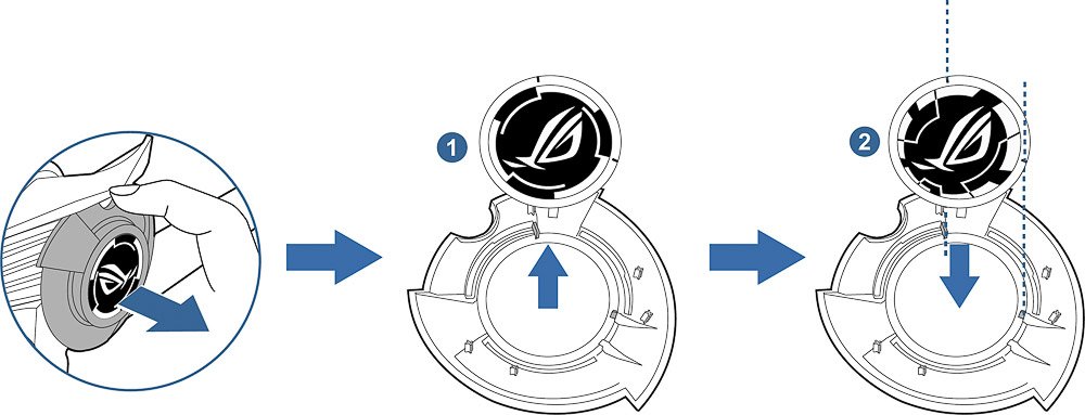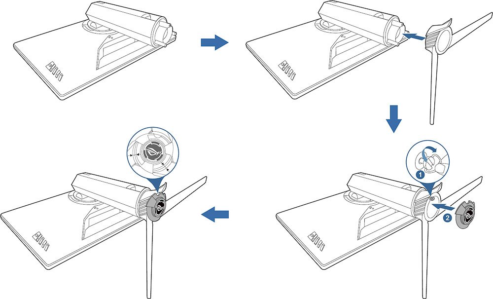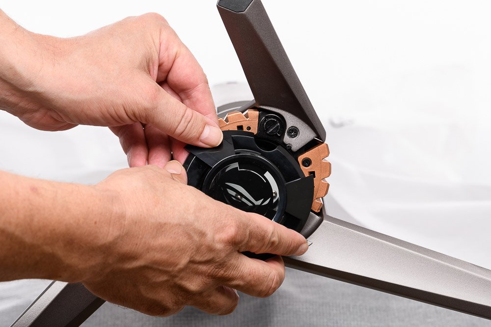 Die Montage des ASUS ROG Swift PG27UQ ist kinderleicht. Das Standbein ist bereits vormontiert und liegt um 90° gewinkelt zusammen mit dem Display im Karton. Das Standbein wird nur noch aufgesteckt und mit einer Flügelschraube werkzeugfrei montiert. Zum Schluss wird eine Kunststoffabdeckung aufgesteckt. Diese enthält austauschbare Kunststoffscheiben, mit denen sich das ROG-Licht-in-Bewegung-Signal anpassen lässt.
