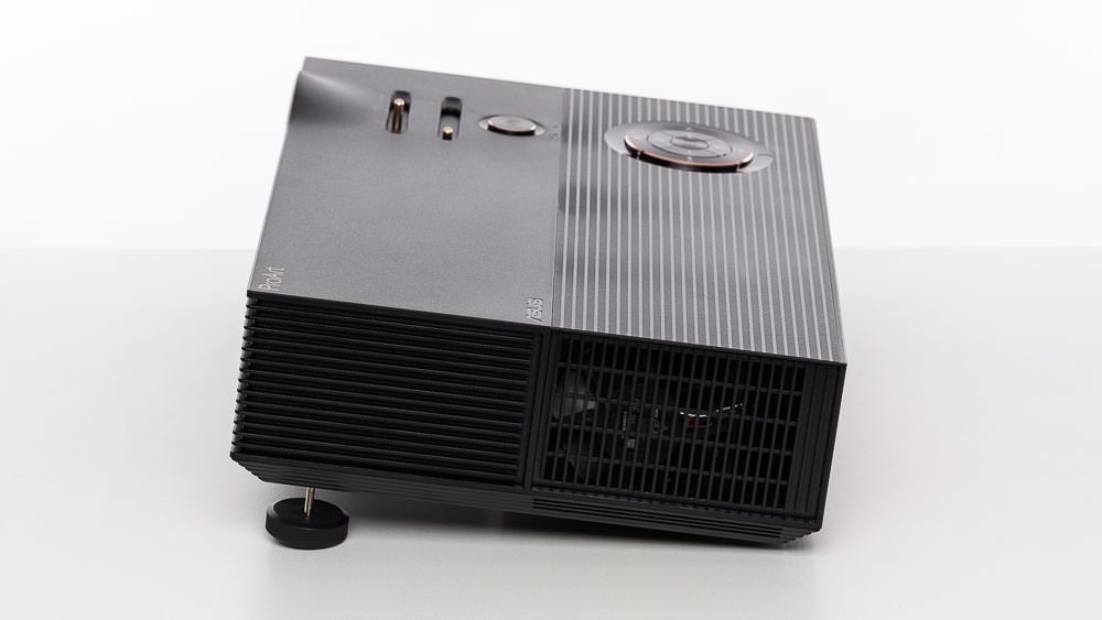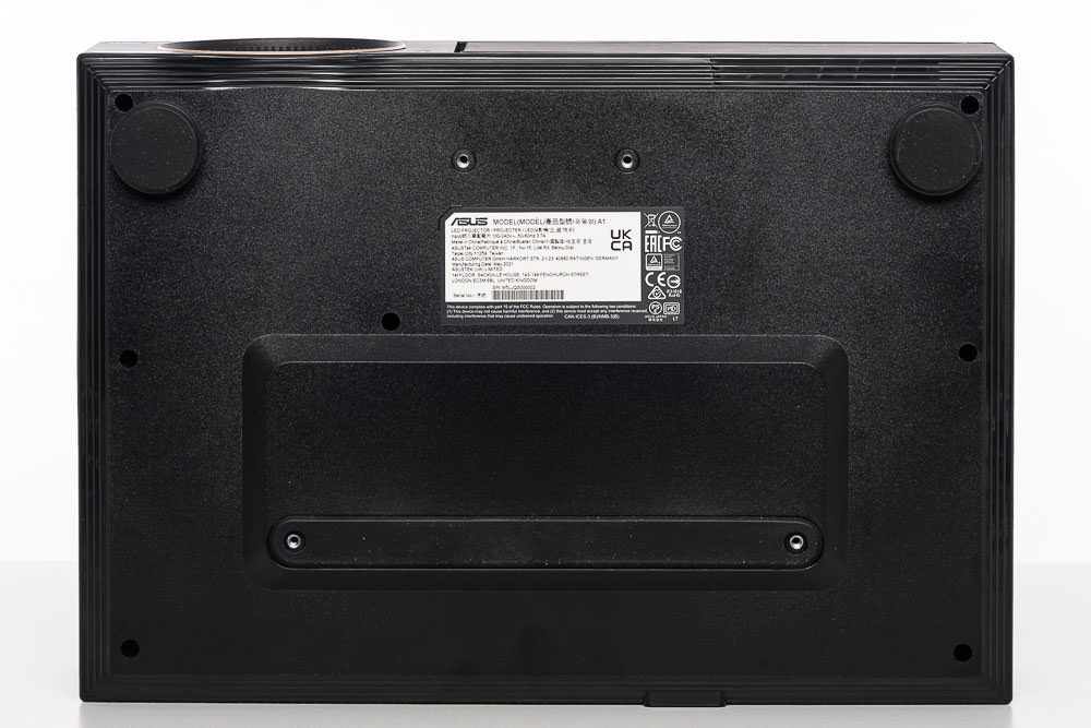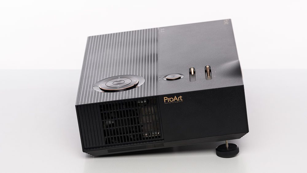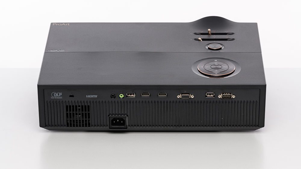 Das anthrazitfarbene Kunststoff-Gehäuse ist ansonsten recht kantig gehalten. Mit seinen Abmessungen von 405 x 99 x 283 mm (B x H x T) und einem Gewicht von 5,7 kg ist der ProArt A1 eher auf eine dauerhafte Aufstellung/Fest-Installation ausgerichtet. Zur Gerätesicherung befindet sich auf der Rückseite die Öffnung für ein Kensington-Kabelschloss. Bohrungen an der Unterseite ermöglichen eine Deckenmontage.