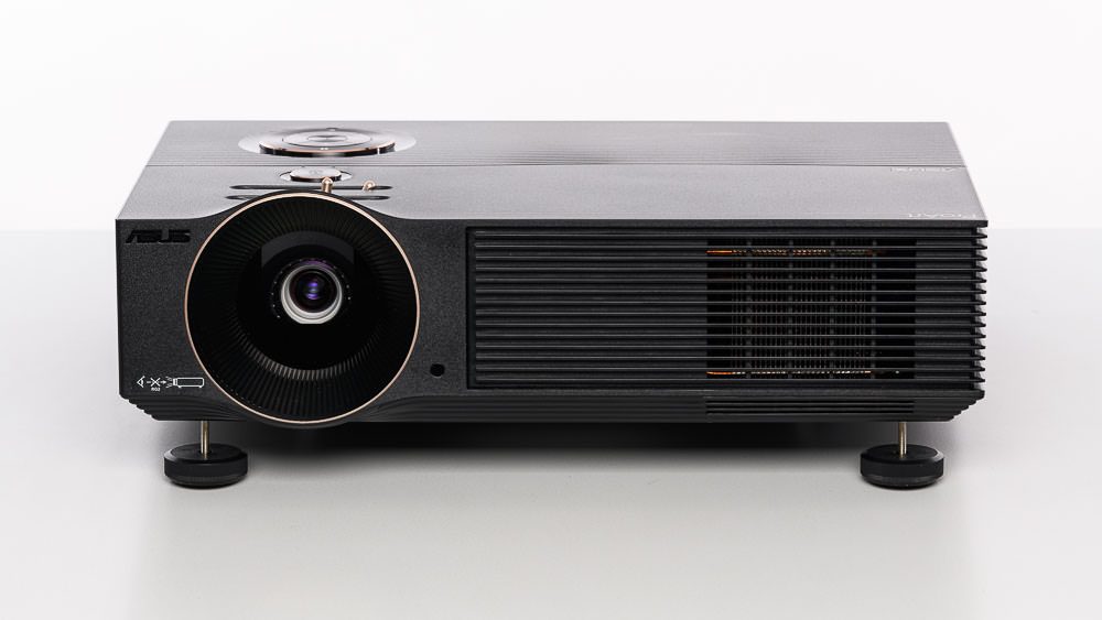 Hatte man zuvor den ultraportablen ASUS ZenBeam S2 in der Hand, wirkt der ASUS ProArt A1 schon recht mächtig. Das Design orientiert sich an klassischen Heimkino-Projektoren und sorgt nicht zuletzt durch das optisch fast schon zu einem kleinen Sternenportal aufgemotzte Objektiv-Auge für einen kräftigen Auftritt.