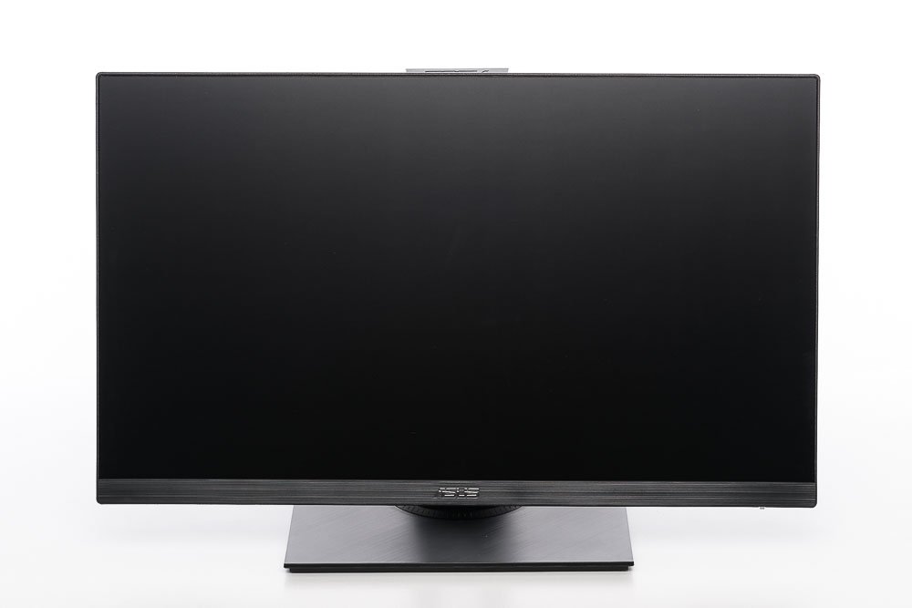 Das Design bezeichnet ASUS selbst als „klassisch-elegant“, und dem kann man sich durchaus anschließen. Von vorn fällt das rahmenlose Design auf. Seitlich und oben misst der Rahmen nur ca. 2 mm. Auffällig ist, dass auch der „Rahmen“, der durch nicht für die Bildanzeige genutzte Bereiche in der Display-Fläche hinzukommt, mit ca. 4 mm überdurchschnittlich schmal ausfällt. Bei der anthrazitfarbigen Leiste unten in der Optik von gebürstetem Aluminium handelt es sich natürlich tatsächlich um Kunststoff.