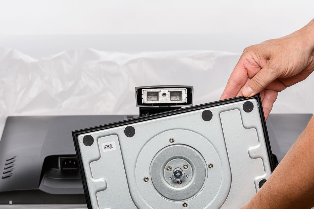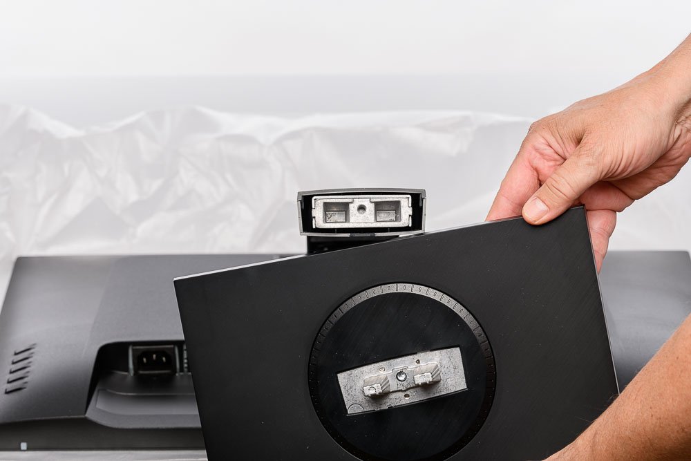 Das Standbein besitzt unten eine großzügige Öffnung, die für das Bündeln der Kabel genutzt werden kann. In Verbindung mit optionalen Kits können ferner Mini-PCs direkt am Standbein befestigt werden und aus dem Monitor einen All-in-One-PC machen.