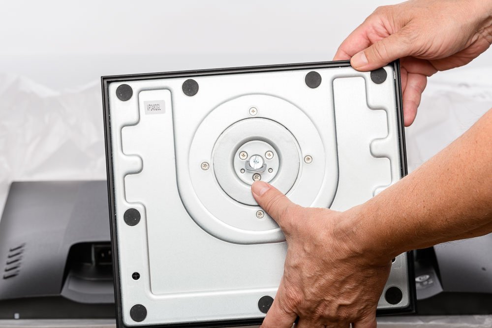 Das Standbein ist bereits ab Werk am Display vormontiert. Lediglich die Bodenplatte muss noch aufgesetzt und mit einer Flügelschraube werkzeugfrei fixiert werden. Man sieht in den Abbildungen auch, dass ASUS – trotz des günstigen Preises – im Inneren des Kunststoffgehäuses nicht an Metall gespart hat.