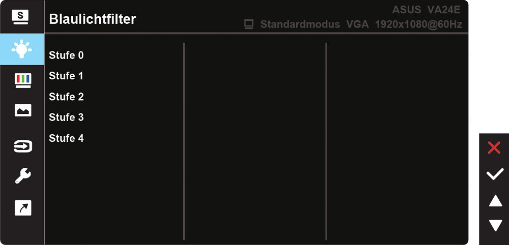 Das OSD des VA24EHL ist ASUS-typisch relativ klar und logisch aufgebaut. Im Bereich rechts daneben wird eine Hilfestellung zu den Möglichkeiten der Navigationstaste eingeblendet. Je nach Betriebsart können einige Optionen ausgegraut sein, wenn diese dort nicht verfügbar sind.