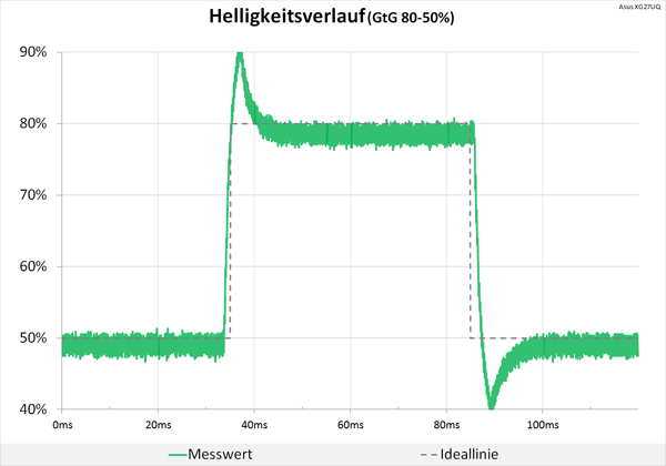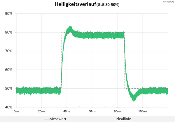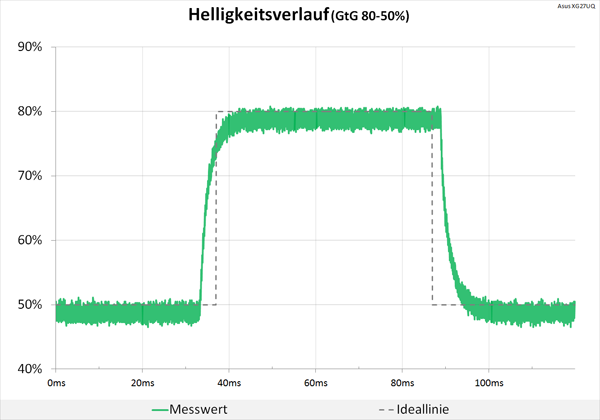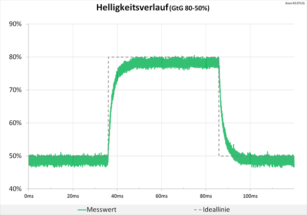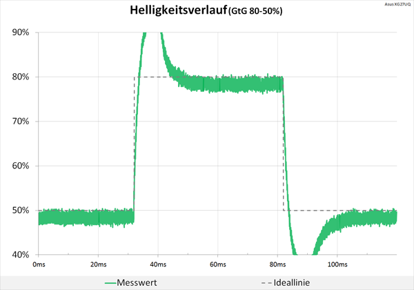 Bei deaktivierter Pixelbeschleunigung (Overdrive-Stufe 0) und 60 Hz zeigt der ASUS XG27UQ die üblichen Schaltzeiten eines Office-Monitors. Den Schwarz-Weiß-Wechsel vollzieht der Proband in 12,4 ms, für einen Grauwechsel werden 10,6 ms benötigt. Der Durchschnittswert für alle 15 Messpunkte beträgt 16,7 ms. Der CtC-Wert liegt bei 15,2 ms. Der Helligkeitsverlauf (GtG 80–50 %) ist aufgrund der kaum vorhandenen Pixelbeschleunigung neutral, und die entsprechende Helligkeit wird schnell erreicht.