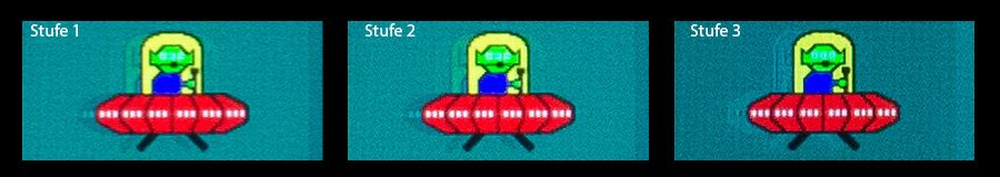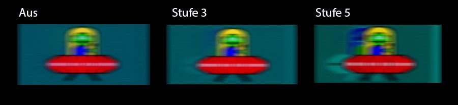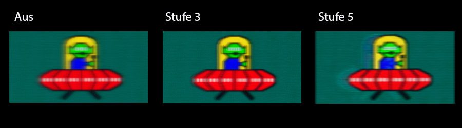 Die Einstellung „Klarheits-Position“ lässt sich über einen Schieberegler auf drei Positionen stellen (oben, Mitte und unten). Hier werden einfach nur die unschönen Doppelbilder in ihrer Position verschoben, die in der Regel bei allen Monitoren entstehen, die auf ein Unschärfebeseitigungs-Tool zurückgreifen. Da sich aber normalerweise alles in der Mitte des Bildes abspielt, sollte man den Schieberegler auf den mittleren Bildbereich stellen.