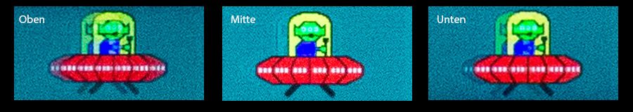 Bei ELMB-Sync lässt sich das Klarheitsniveau erst gar nicht regeln. Die Schärfe lässt sich in etwa mit Stufe 1 oder 3 vergleichen, wenn einzig ELMB aktiv ist. Die Qualität der Bewegungsunschärfereduzierung ist bei mittlerer Klarheitsposition mehr als ordentlich. Oftmals sieht man bei solchen Tools Dreifachbilder, die bei dem ASUS ROG Strix XG32UQ aber nur vorkommen, wenn sich die Klarheitsposition im oberen oder unteren Bereich befindet. Das folgende Bild zeigt den Vergleich im oberen, mittleren und unteren Bildteil bei mittlerer Stellung der Klarheitsposition.