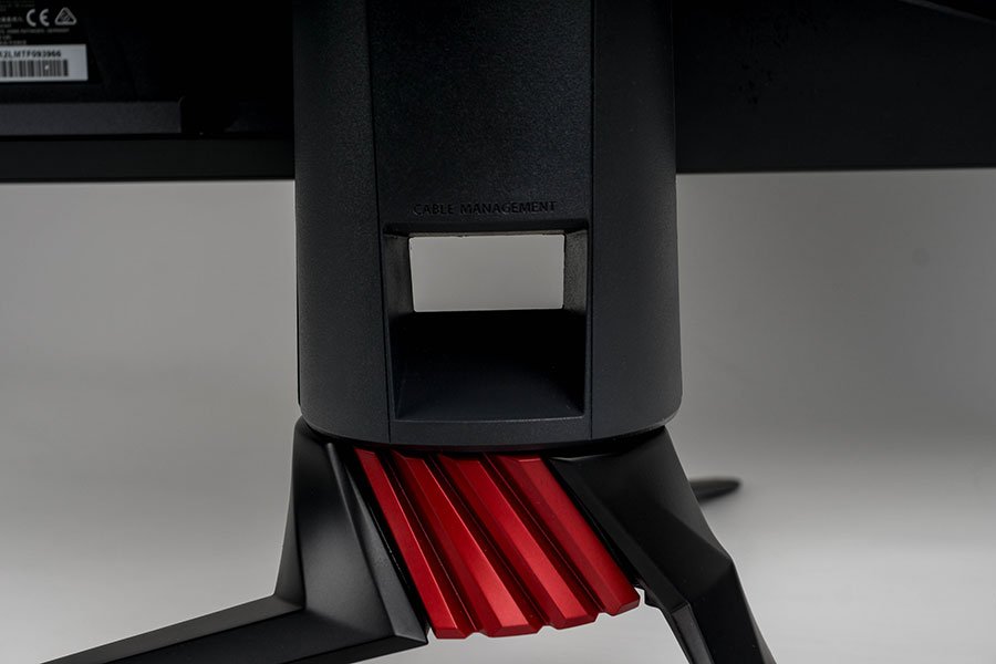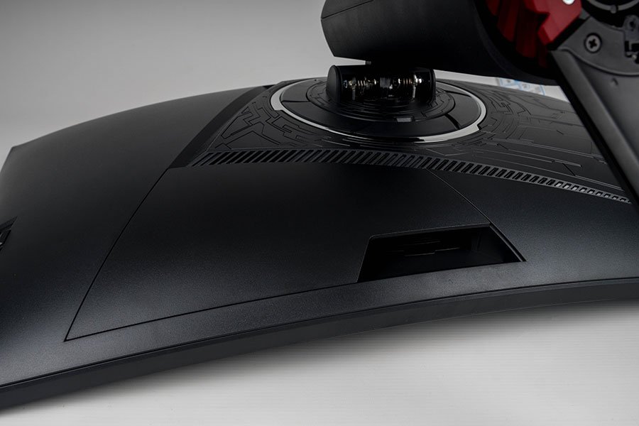 Direkt darunter ist auch schon der Fuß mit dem Tragarm verbunden, der zusätzlich über futuristische rote Details verfügt und aus Metall besteht. Hier befindet sich auch die Drehfunktion, die ein seitliches Schwenken um 50 Grad zu jeder Seite erlaubt. Mit einem Pivot-Modus kann der ASUS ROG Strix XG32VQR nicht dienen.
