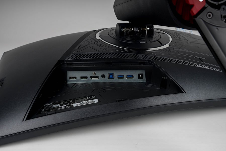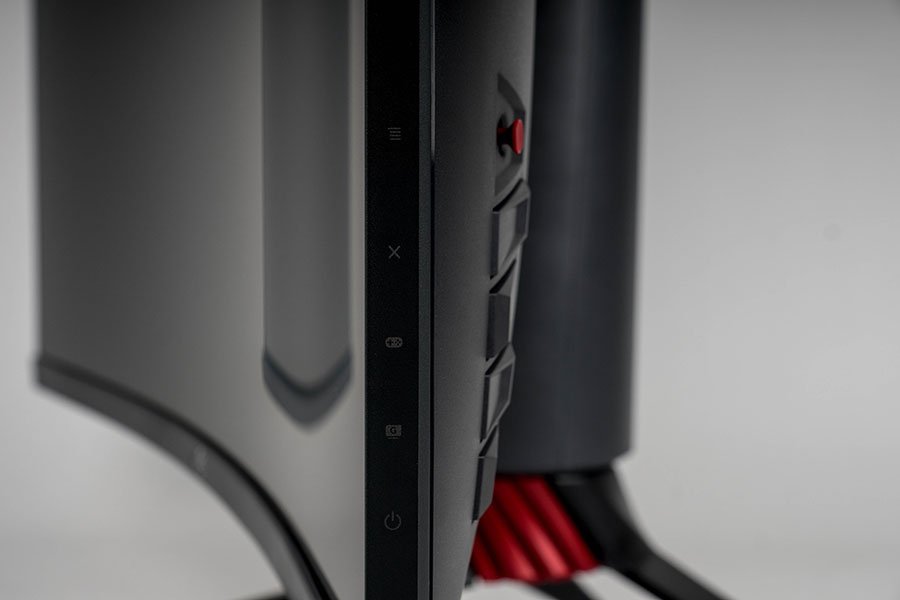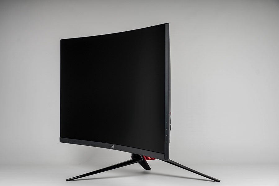 Das mit 32 Zoll sehr große Display mit 1800-R-Krümmung verfügt oben und an den Seiten über ein randloses Design, bei dem das Panel einzig über ein 2 mm schmales Band eingefasst wird.