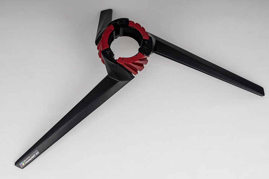 Die zwei großen Ausleger des spinnenartigen Fußes sorgen für einen enormen seitlichen Halt. Leider stehen sie in einem so großen Winkel zueinander, dass das Konstrukt nach vorn nur noch wenig Halt erfährt. Der kleine Stumpf auf der Rückseite macht seine Arbeit hingegen gut und lässt das Display auch bei härteren Stupsern nach hinten nicht aus dem Gleichgewicht kommen. Um den Untergrund zu schonen und maximalen Halt zu geben, sind die drei Füße auf der Stellfläche mit kleinen Gummiplättchen versehen.