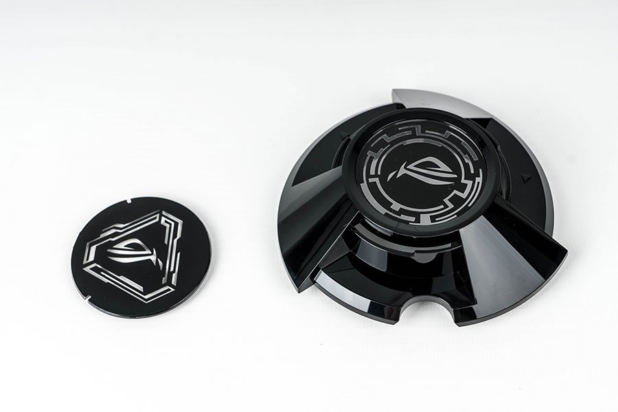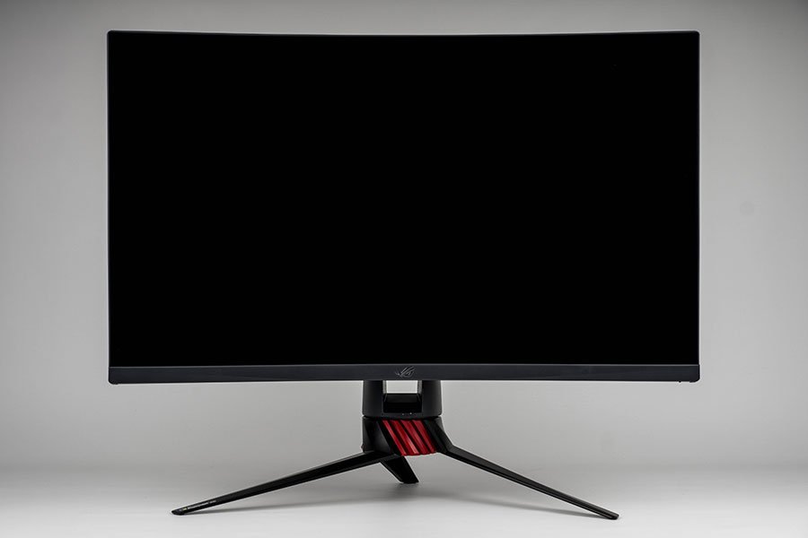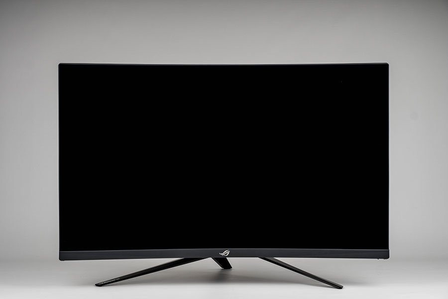 Tatsächlich fängt das sichtbare Bild allerdings erst 10 mm nach innen versetzt an, wie es bei sämtlichen randlosen Monitoren der Fall ist. Unten beträgt die Breite des Rahmens etwa 22 mm und zeigt mittig das ROG-Logo in Silber.