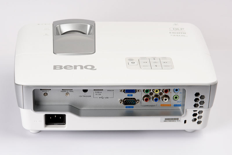 Bei den Anschlussmöglichkeiten gibt sich das Test-Gerät BenQ W1080ST+ dagegen großzügig. Von links nach rechts zeigt die Abbildung: 2 x HDMI (1 x MHL), DC-12V-Trigger (3.5-mm-Jack), 2 x USB (1 x Mini Typ B, 1 x Typ A), RGB BGA-Analog (D-Sub 15-Pin), RS232 (DB-9-Pin), Component Video, Composite Video in (RCA), Audio in: 2 x L/R-Cinch und 1 x 3,5-mm-Klinke, Audio out (3,5-mm-Klinke) und Stromanschluss.