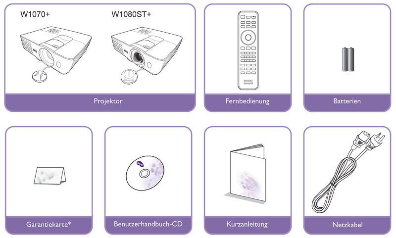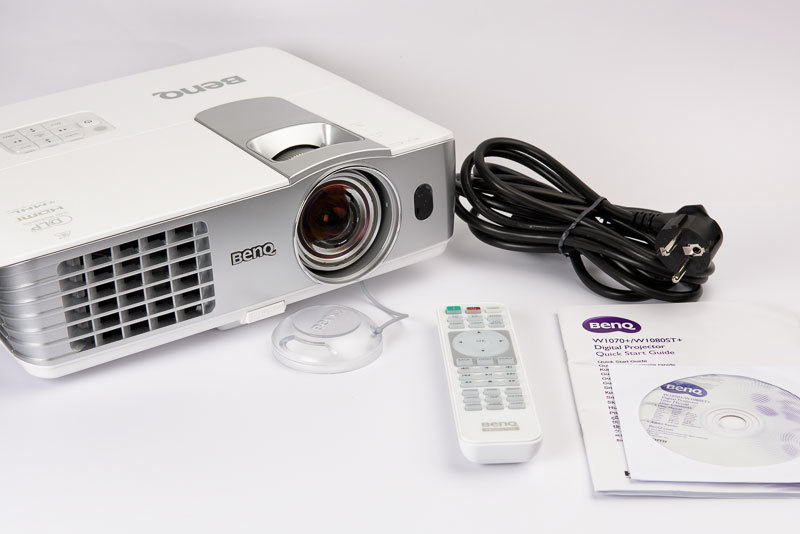 Der Lieferumfang des BenQ W1080ST+ beschränkt sich auf das Notwendigste: Projektor, Netzkabel, Fernbedienung und Handbuch auf CD. Erfreulich ist, dass der Projektor zum Schutz des großen Kurzdistanz-Objektivs eine Schutzkappe mitbringt und damit auch gut transportabel ist. Das Handbuch ist recht ausführlich und verständlich geschrieben.