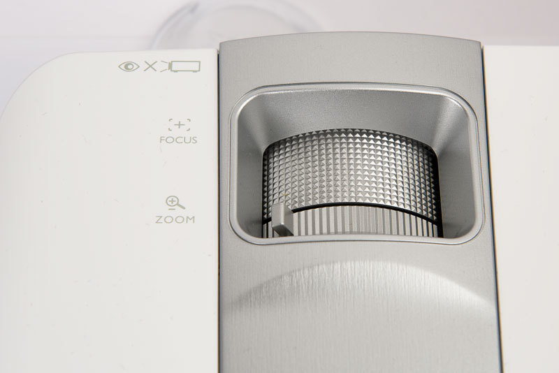 Die Bildgröße kann über einen 1,2-fach-Zoom reguliert werden. Das ist zwar nicht üppig, aber dennoch sehr hilfreich. Zur Schärfeeinstellung ist über die Oberseite ein geriffelter Fokussierring zugänglich (vorderer Ring). Er ist ordentlich breit, leichtgängig und agiert ohne Spiel. Auch bleibt das Bild beim Fokussieren ausreichend stabil, das heißt, es findet keine Verschiebung des projizierten Bildes statt.