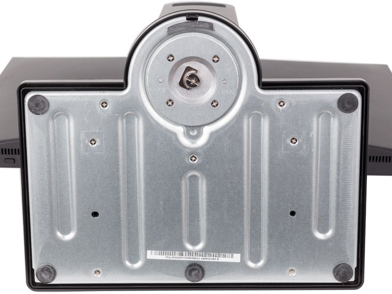 Bei einem Blick von hinten ist erkennbar, dass der verbaute Standfuß die vorhandenen VESA-100-Bohrungen bereits belegt. Neben dem Loch im Standfuß ist auch der Griff im oberen Teil erkennbar. Da der BenQ BL2480T insgesamt nur knapp über 5 kg wiegt, kann er über diesen bequem getragen werden.