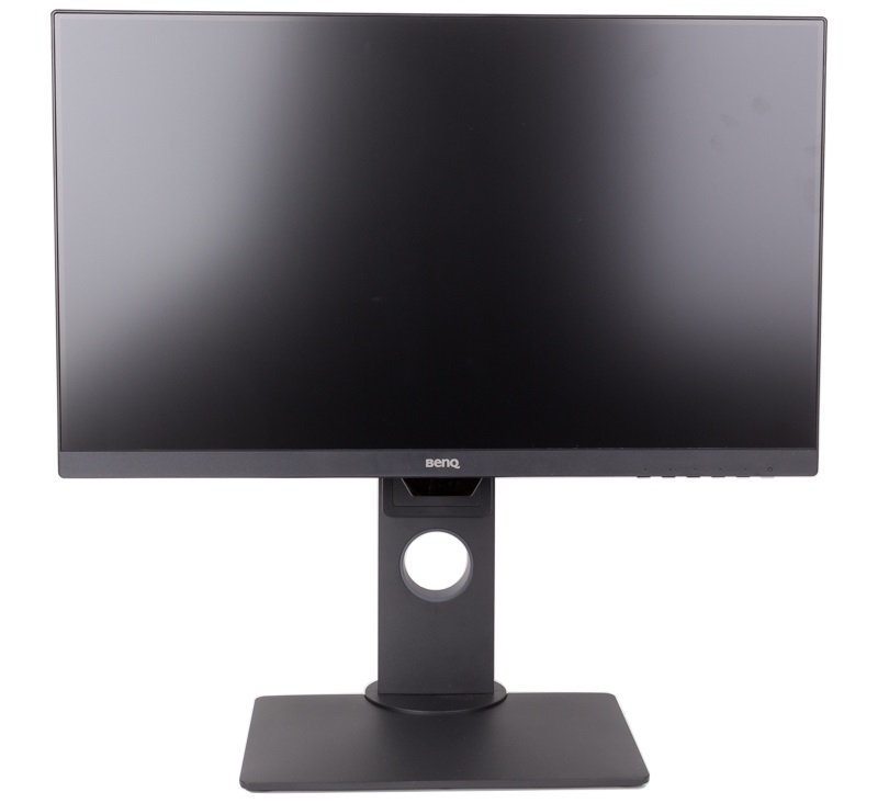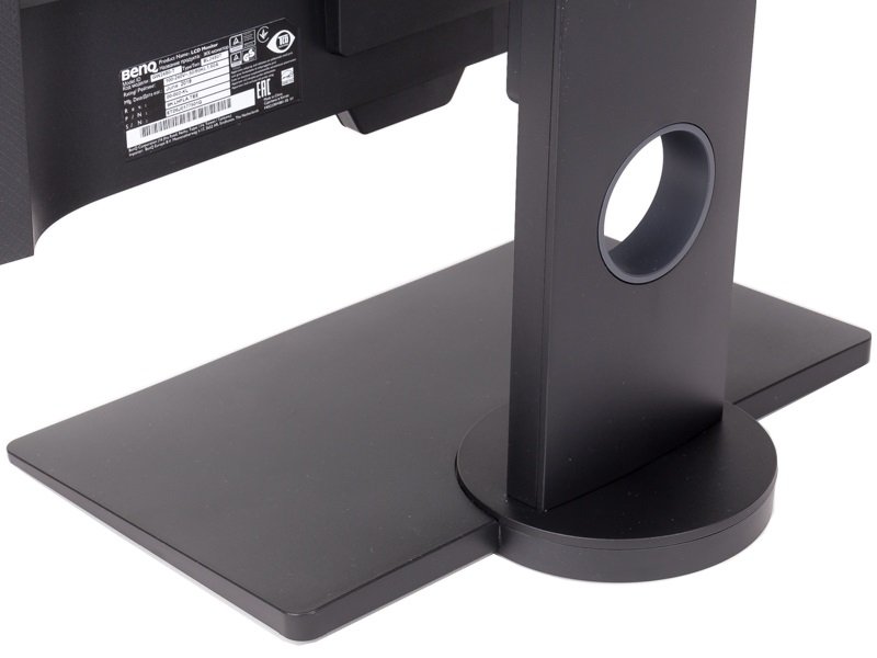 Das Standbein wird bereits am Business-Monitor befestigt ausgeliefert. Vor dem Betrieb muss daher nur noch der Standfuß an diese Kombination geschraubt werden, was auch ohne Werkzeug möglich ist. Der Standfuß wurde ausreichend groß dimensioniert und hält das Gerät sicher an seinem Platz. Er besitzt ein Loch im Standfuß, um die Kabel nach hinten zu führen. Das matte schwarze Design wurde beim gesamten Gehäuse des BenQ BL2480T verwendet.