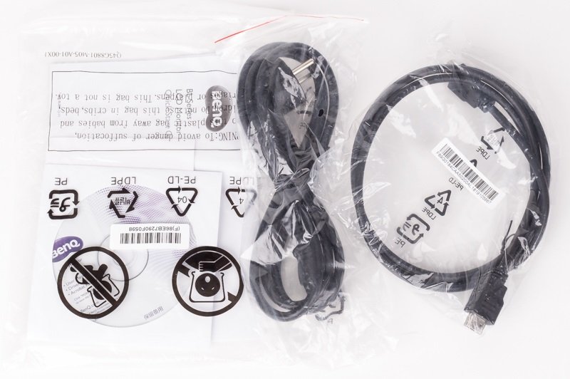 Der schmale Karton besitzt zwei große Styropor-Elemente, die den Business-LED-Monitor vom Zubehör trennen und einen sicheren Transport garantieren sollen. Im Lieferumfang befinden sich eine Kurzanleitung, eine CD mit einem ausführlichen Handbuch sowie je ein Strom- und HDMI-Kabel. Der Umfang fällt damit zweckmäßig aus. Soll der BenQ BL2480T per DisplayPort oder VGA angeschlossen werden, müssen entsprechend zusätzliche Kabel erworben werden.