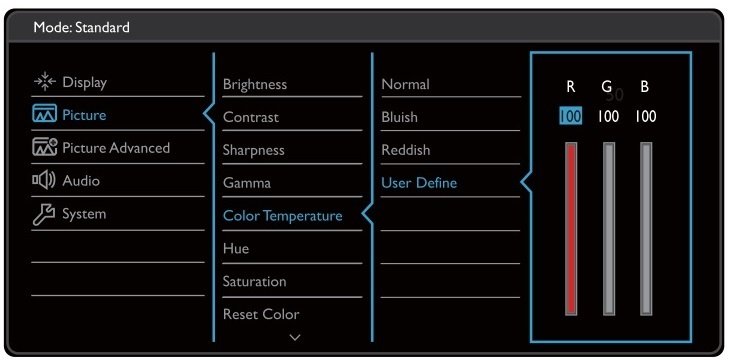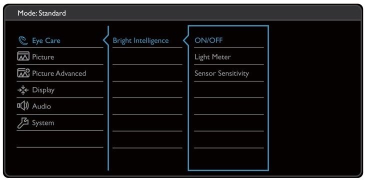Das eigentliche OSD hat sechs Reiter. Im ersten können der Helligkeitssensor, der Blaulichtfilter und ein Farbfilter aktiviert und eingestellt werden. Bei den Bildeinstellungen ist neben den üblichen Parametern auch die Reaktionszeit des Monitors einstellbar.