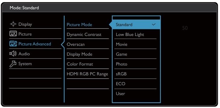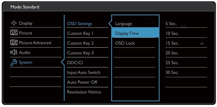 Die erweiterten Bildeinstellungen wirken auf den ersten Blick umfangreich. Erst bei einer genauen Betrachtung unter einer gewählten Anschlussart wird deutlich, dass viele Optionen nur bei bestimmten Anschlussarten zur Verfügung stehen. In den Systemeinstellungen finden sich die angesprochenen Schnellzugriffe sowie allgemeine OSD-Einstelloptionen.