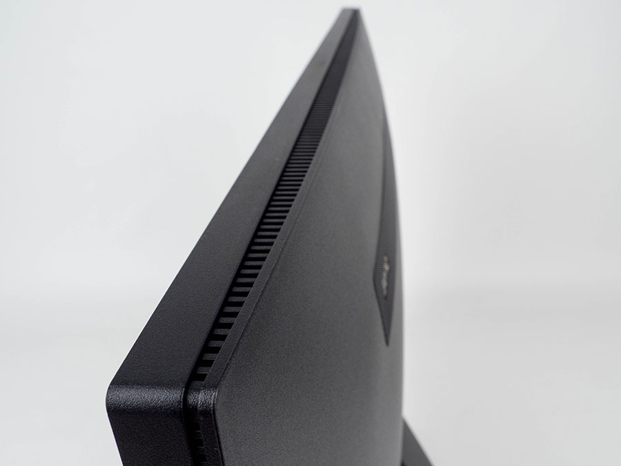 Das Panel verfügt über ein rahmenloses Design, da es oben und an den Seiten nur von einem schmalen, 2 mm breiten Rand umgeben ist. Das sichtbare Bild beginnt allerdings erst 10 mm nach innen versetzt, wie wir es bereits von anderen Monitoren kennen. Der untere Rand ist etwa 34 mm hoch und verfügt über eine Lochstruktur.