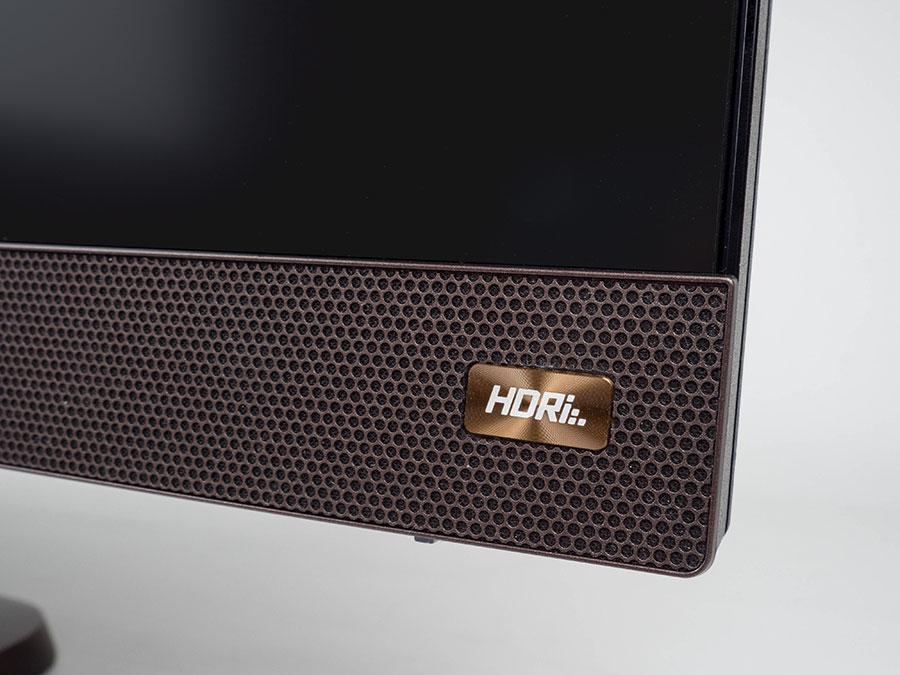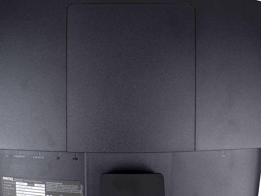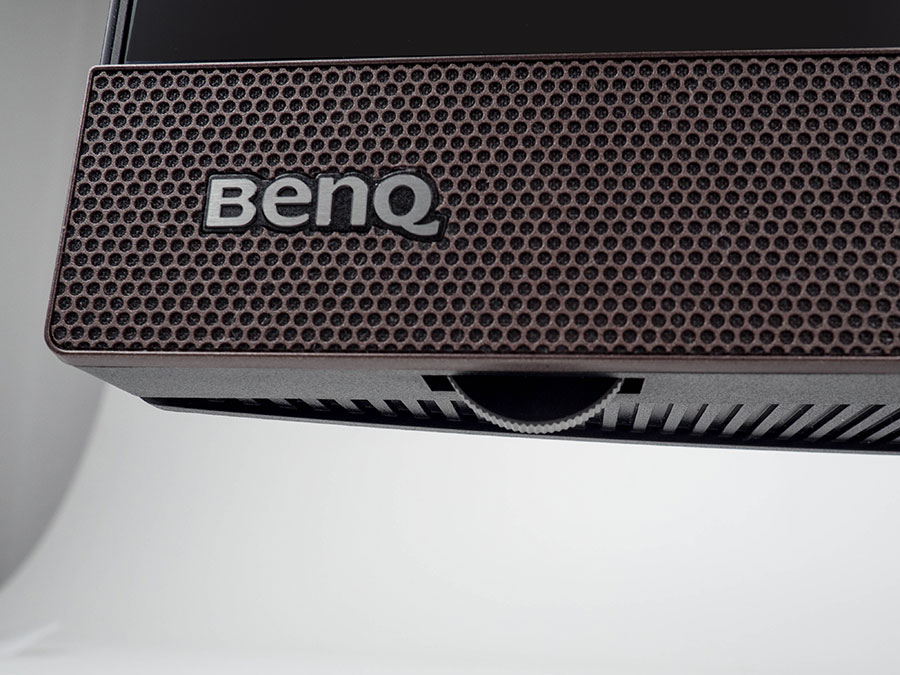 Er wird mittig durch den Sensor unterbrochen, der Licht-, Näherungs- und IR-Empfänger vereint. Auf der linken Seite ist das BenQ-Logo eingearbeitet. Auf der rechten Seite befindet sich ein Badge mit der Aufschrift „HDRi“.