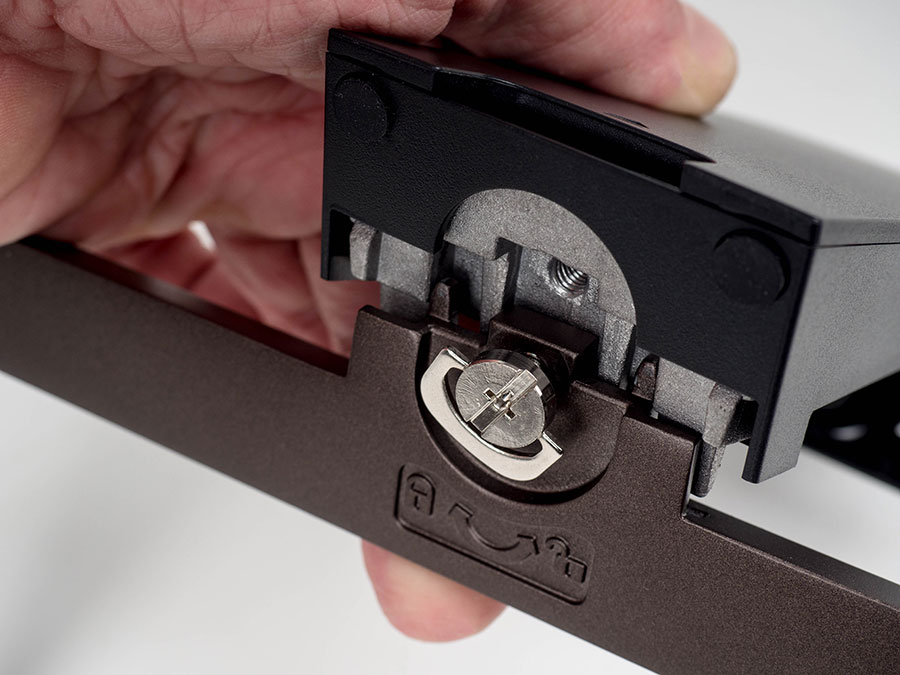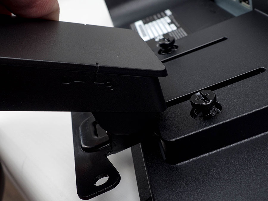 Im Anschluss werden die verbundenen Teile in die Schiene der Halterung am Monitor eingeschoben und zuletzt mithilfe eines Schraubendrehers verschraubt.