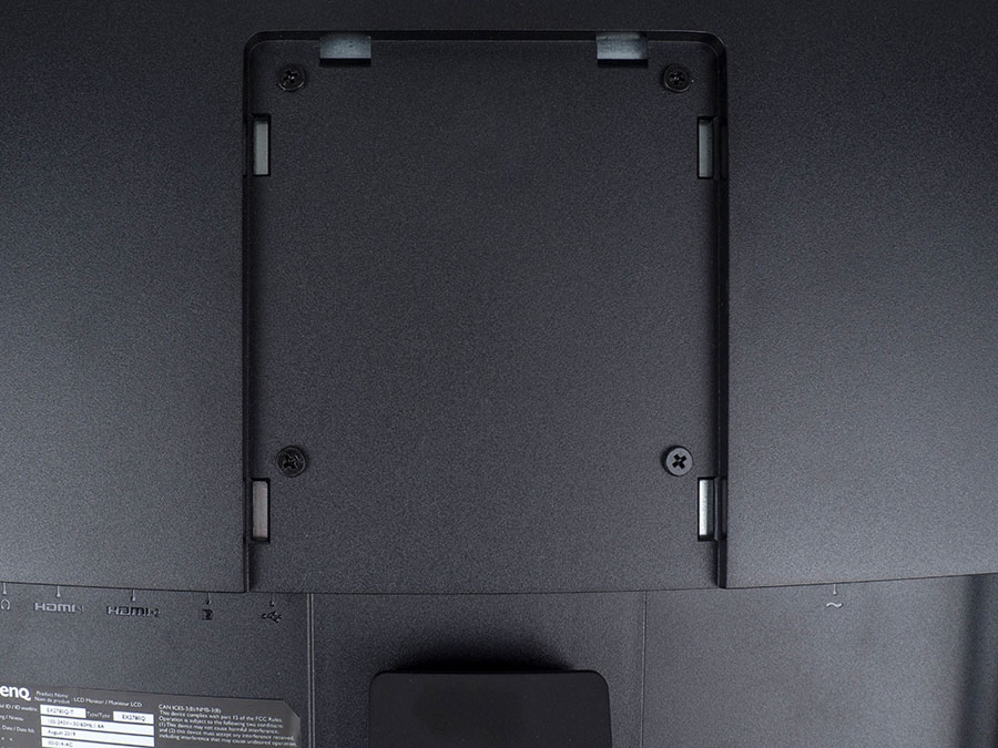 Die Rückwand gewinnt in Richtung Mitte leicht an Tiefe. Im oberen Bereich verdeckt ein feinmaschiges Gitter den Subwoofer. Etwas darunter ist eine Blende angebracht, um die VESA-Vorrichtung abzudecken.