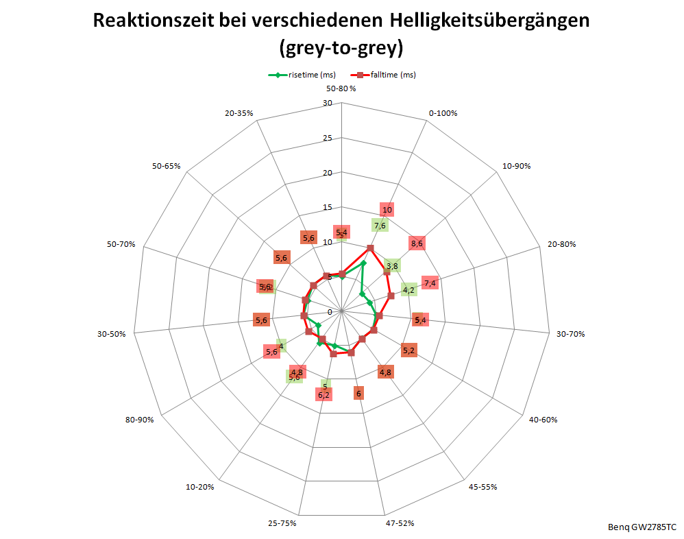 In den folgenden Netzdiagrammen sehen Sie alle Messwerte zu den unterschiedlichen Helligkeitssprüngen unserer Messungen im Überblick. Im Idealfall würden sich die grünen und die roten Linien eng am Zentrum befinden. Jede Achse repräsentiert einen im Pegel und in der Dynamik definierten Helligkeitssprung des Monitors, gemessen über Lichtsensor und Oszilloskop.