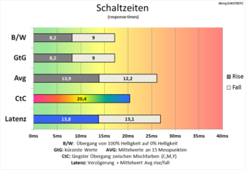 Während die Signalverzögerung bei 60 Hz mit 19,4 ms recht lang ausfällt, wird sie durch die Ansteuerung mit 75 Hz auf 13,8 ms verbessert. Die halbe mittlere Bildwechselzeit ist dafür mit 5,7 ms (statt 5,1 ms) nur minimal schlechter. Insgesamt macht das 19,5 ms.