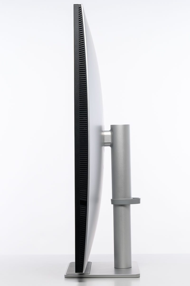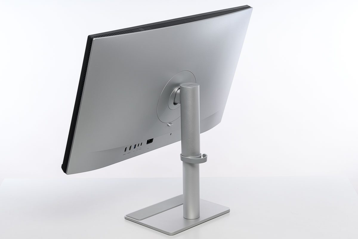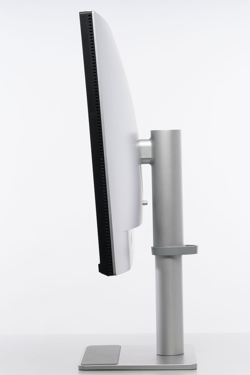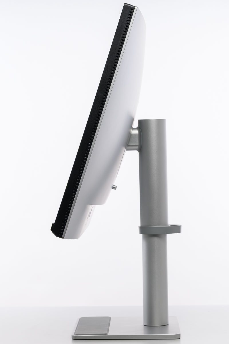 Zugleich bleibt es nicht bei bloßer Imitation: Beide Bauteile fühlen sich teilweise durchaus kühl an, was gut dazu passt, dass im Inneren sichtbar nicht an Metall gespart wurde. Auch Verarbeitung und Spaltmaße geben keinen Anlass zur Kritik. Der BenQ MA320UP wirkt sauber gefertigt und insgesamt hochwertiger, als es die Materialwahl auf den ersten Blick vermuten lässt. Die entsprechenden Ansichten in hoher und niedriger Stellung sowie in der Drehung unterstreichen diesen aufgeräumten und gefälligen Gesamteindruck.