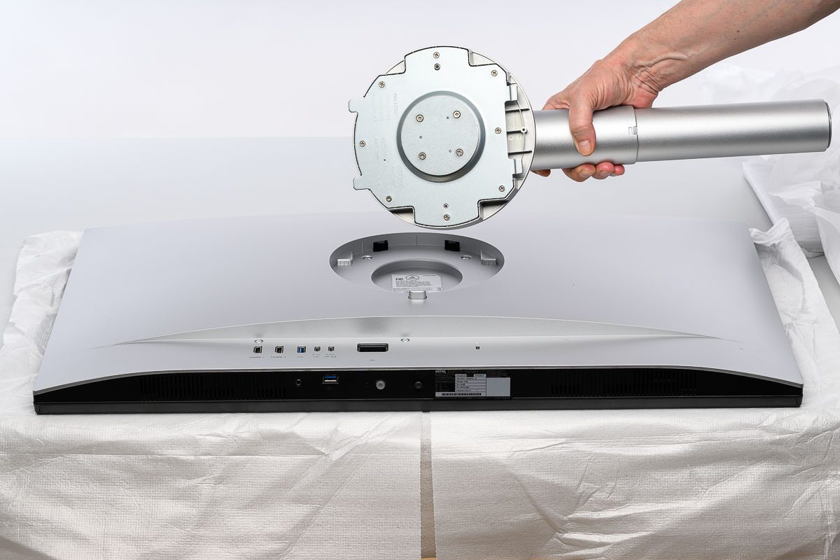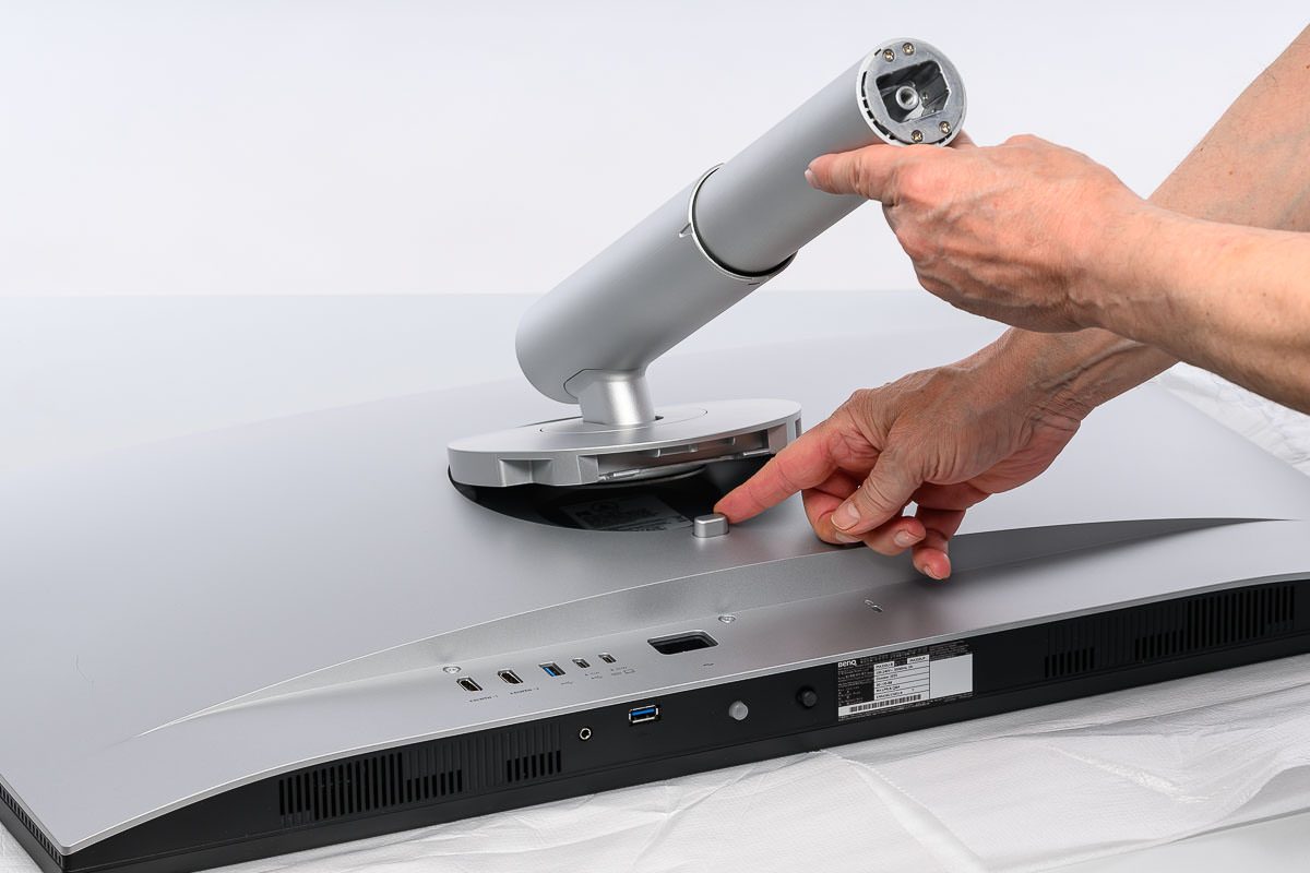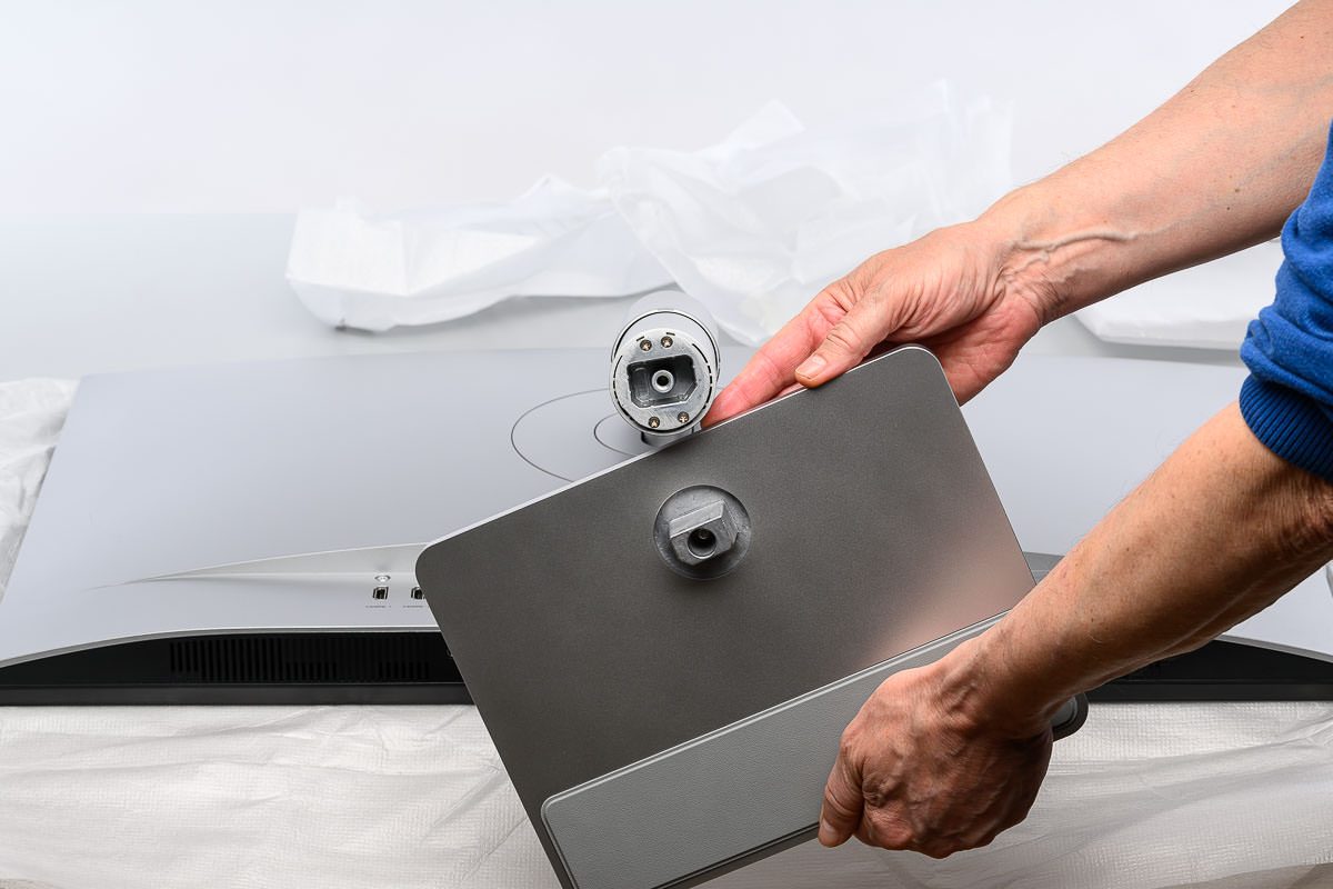 Unsere Abbildungen zeigen die Montage stattdessen auf dem Schreibtisch, weil sich die einzelnen Schritte dort besser erkennen lassen. Das Standbein wird wie üblich auf der Display-Rückseite eingeklickt und kann per Knopfdruck auch ganz leicht wieder entfernt werden. Anschließend wird die Bodenplatte aufgesetzt und werkzeuglos über eine Flügelschraube an der Unterseite des Sockels fixiert.