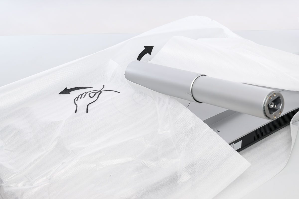 Die Montage des BenQ MA320UP ist einfach gehalten und im Grunde schnell erledigt. Der Hersteller hat die Verpackung dabei praxisnah vorbereitet: Standbein und Sockel lassen sich zunächst separat montieren, anschließend kann das Display mit dem bereits angesetzten Standbein direkt aus dem Karton gehoben werden. Selbst die geschlitzte Schutzhülle des Bildschirms ist darauf ausgelegt.