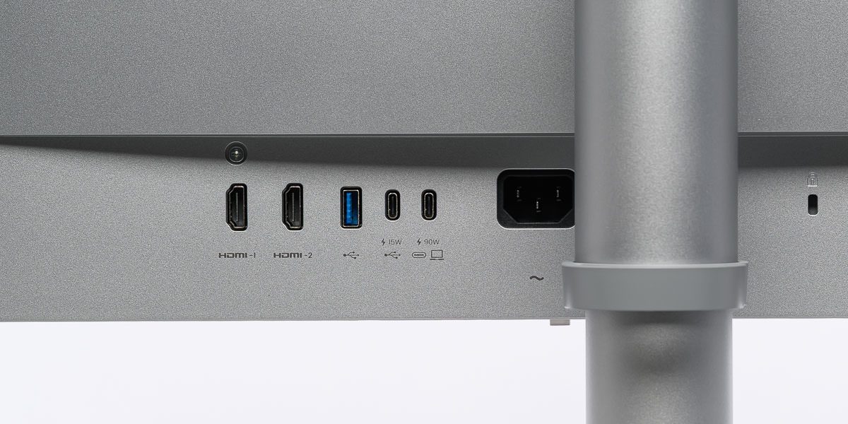Bei den Anschlüssen setzt der BenQ MA320UP auf eine stimmige, klar auf den Desktop-Alltag ausgerichtete Auswahl. Zur Verfügung stehen zwei HDMI-2.0-Eingänge, ein USB-C-Upstream (DP-Alt-Modus, Datenübertragung und 90 Watt PD), ein USB-C-Downstream (3.2 Gen 1, 15 Watt PD) sowie zwei USB-A-Downstreams (3.2 Gen 1, 7,5 Watt PD). Die Ausstattung ist damit klar auf ein aufgeräumtes Ein-Kabel-Setup rund um Notebook und Peripherie zugeschnitten, ohne in Richtung Docking-Monitor mit KVM- oder Multi-Host-Fokus auszuschweifen.
