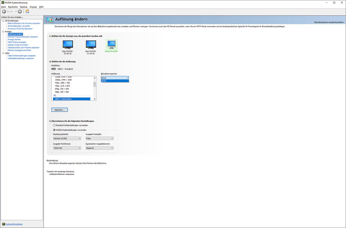In der Praxis zeigte sich am NVIDIA-System jedoch nicht einfach ein klarer Wechsel auf 30 Hz, sondern vielmehr ein Verbleib bei 60 Hz bei zugleich reduzierter Farbausgabe. Für den Desktop-Betrieb ist beides unbefriedigend: 30 Hz sind heute keine ernsthafte Arbeitsgrundlage mehr, eine verringerte Signalqualität bei 60 Hz aber ebenso wenig.