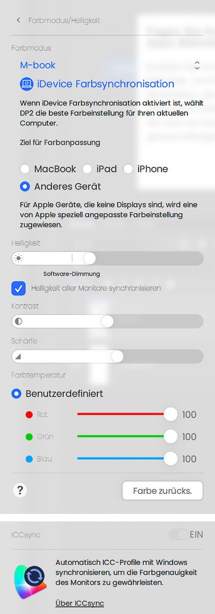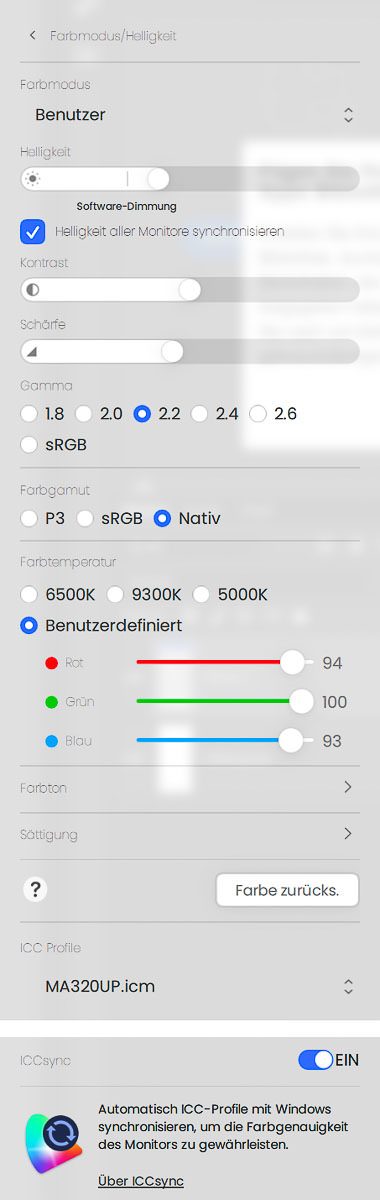 Ein zentrales Feature von Display Pilot 2 ist ICCsync. Beim Wechsel des Bildmodus wird automatisch das passende ICC-Profil in der Farbverwaltung des Betriebssystems hinterlegt, was im Test zuverlässig, wenn auch teils mit leichter Verzögerung funktionierte. Praktisch ist dabei, dass sich auch selbst erstellte Profile verwenden lassen. Dafür müssen sie dem jeweiligen Bildmodus jedoch ausdrücklich in der Software zugewiesen werden – ein Schritt, den man leicht übersieht. Andernfalls greift Display Pilot 2 weiter auf die hinterlegten Standardprofile zurück.