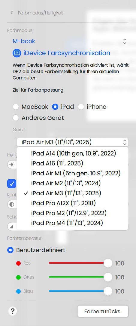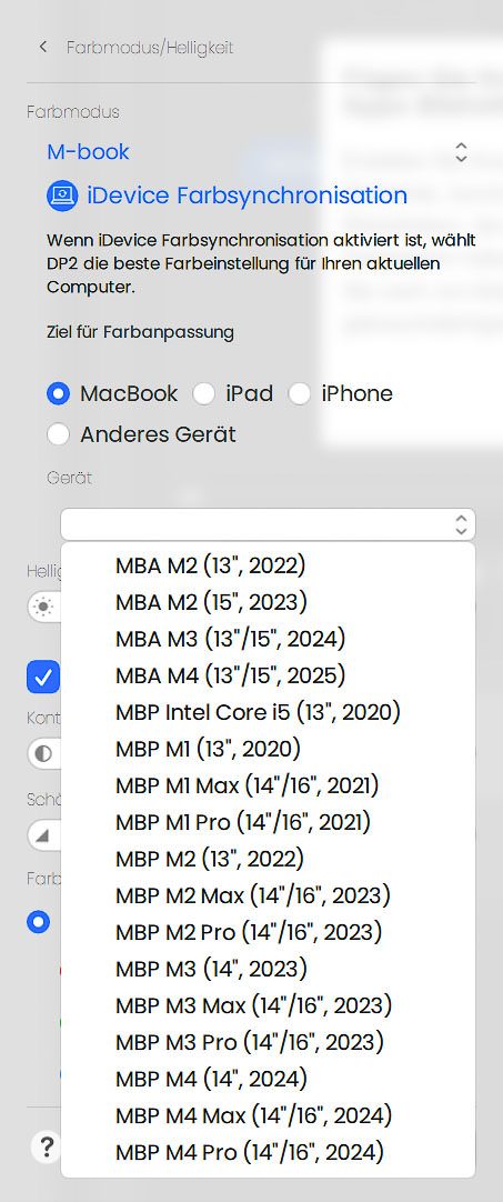 Der erste Screenshot zeigt das Hauptmenü von Display Pilot 2. Ab Werk ist der Bildmodus „M-Book“ aktiv, ergänzt um die iDevice-Farbsynchronisation. Dabei kann man zwischen MacBook, iPad und iPhone als Zielgerät wählen, um die Farbdarstellung des Monitors möglichst eng an das jeweilige Apple-Gerät anzunähern. Das geht sichtbar über ein simples OSD-Ersatzwerkzeug hinaus und richtet sich klar an die Apple-nahe Zielgruppe des BenQ MA320UP. Die Screenshots 3 bis 5 zeigen, welche Geräte dabei jeweils zur Auswahl stehen.