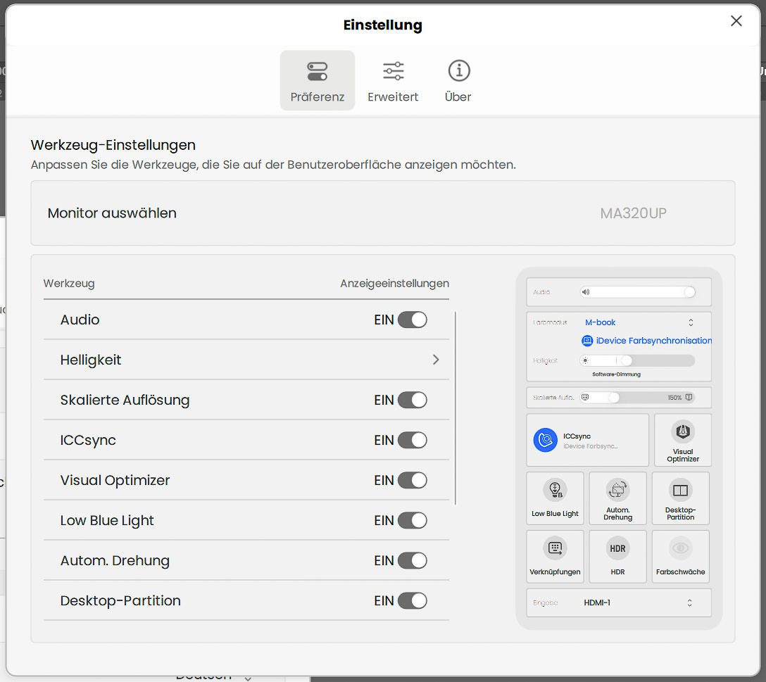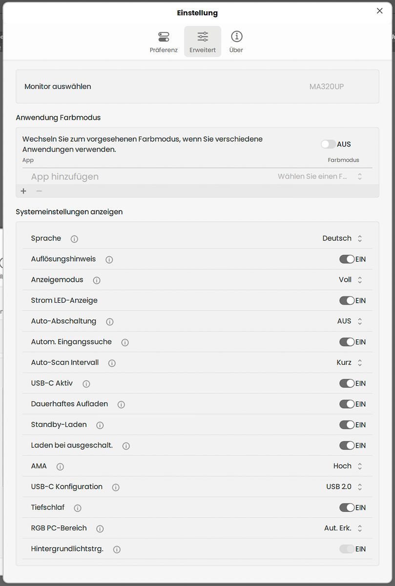 Im Folgenden zeigen wir noch die Screenshots zu den Konfigurationsmöglichkeiten der Software. Der erste Menüpunkt „Präferenz“ bezieht sich auf die Software selbst. Unter „Erweitert“ findet man dagegen Punkte, die das Innenleben des Monitors betreffen und sonst üblicherweise unter dem OSD-Punkt „Systemeinstellungen“ zu finden wären.