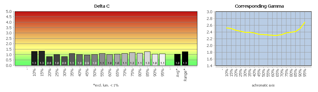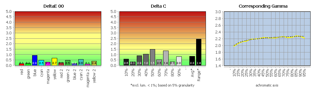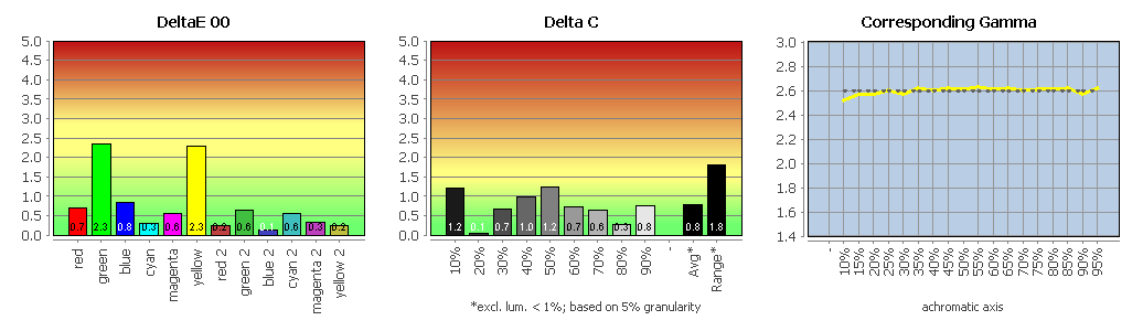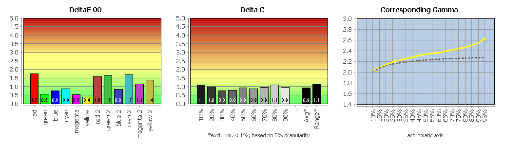 Die Erläuterungen zu den folgenden Charts haben wir für Sie zusammengefasst: Delta-E-Abweichung für Farbwerte und Weißpunkt, Delta-C-Abweichung für Grauwerte, und Gradation.