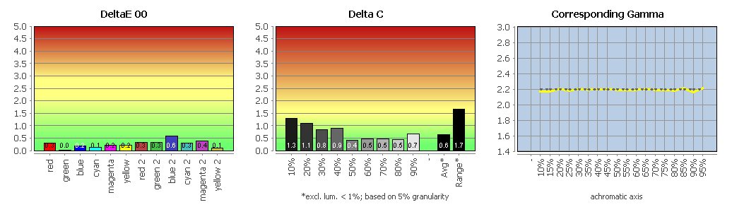 Die eigentliche Profilvalidierung überzeugt ebenfalls. Der durchschnittliche Delta-E-2000-Wert liegt bei nur 0,43, das Maximum bei 1,70. Das Matrix-Profil beschreibt den kalibrierten Zustand damit sehr exakt. Auffällige Drifts oder unschöne Nichtlinearitäten waren nicht festzustellen.