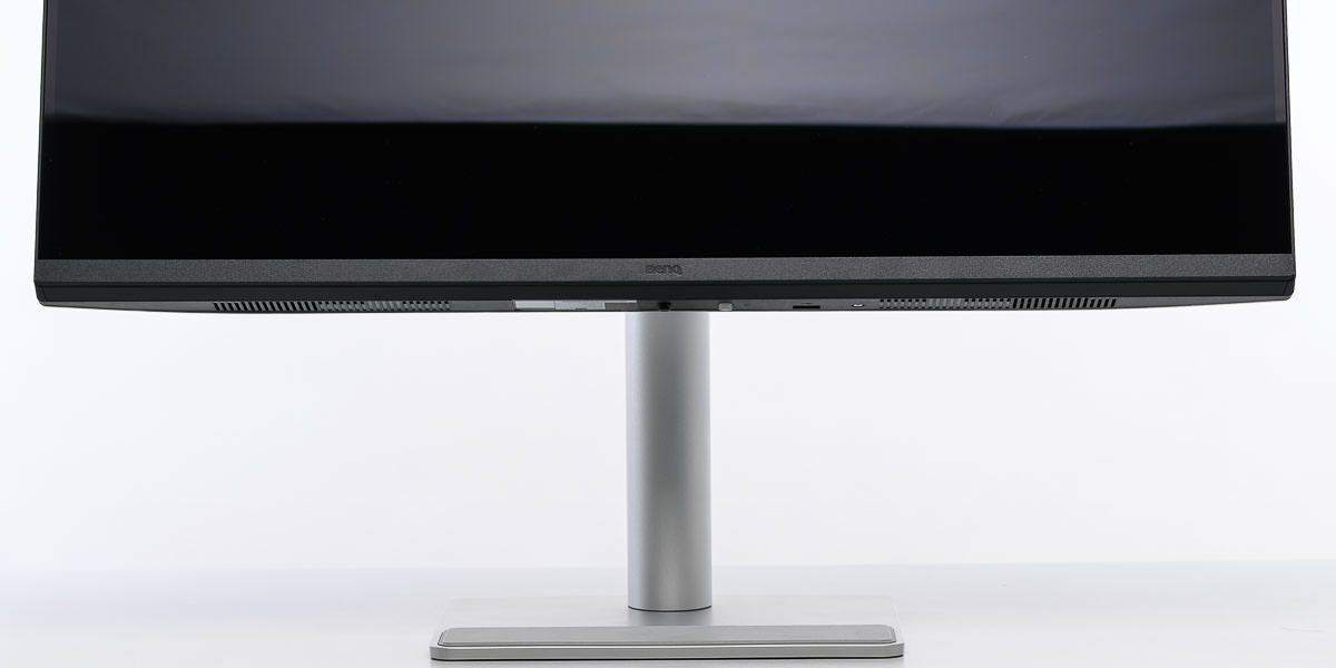 Tonsignale verarbeitet der BenQ MA320UP an allen Eingängen, die auch Videosignale entgegennehmen. Die Ausgabe ist dabei sowohl über den Kopfhörerausgang als auch eigenständig über die integrierten Stereo-Lautsprecher möglich. Sie verfügen über eine Ausgangsleistung von 2 × 3 Watt. Die genaue Position ist von außen nicht ersichtlich. Wir vermuten, dass sie am Rand unten angebracht sind.