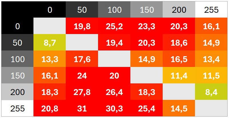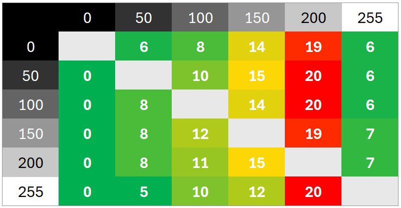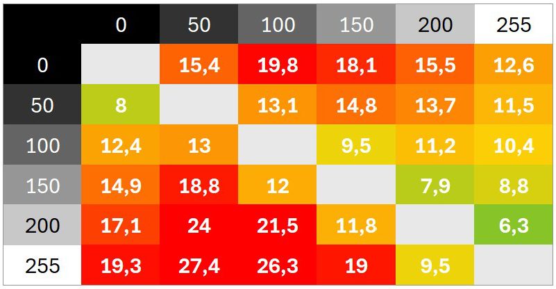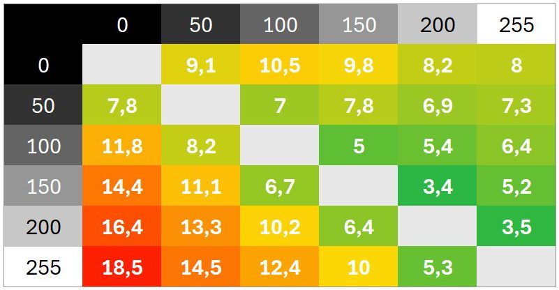 Überschwinger sind keine zu beobachten. Die Abstimmung ist sehr neutral. Das Schaltzeiten-Diagramm zeigt unter anderem, wie sich verschiedene Helligkeitssprünge addieren und wie schnell der Monitor in der Werkseinstellung im besten Fall reagiert.