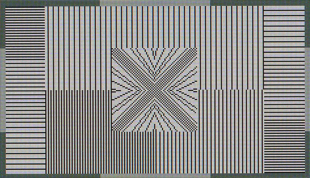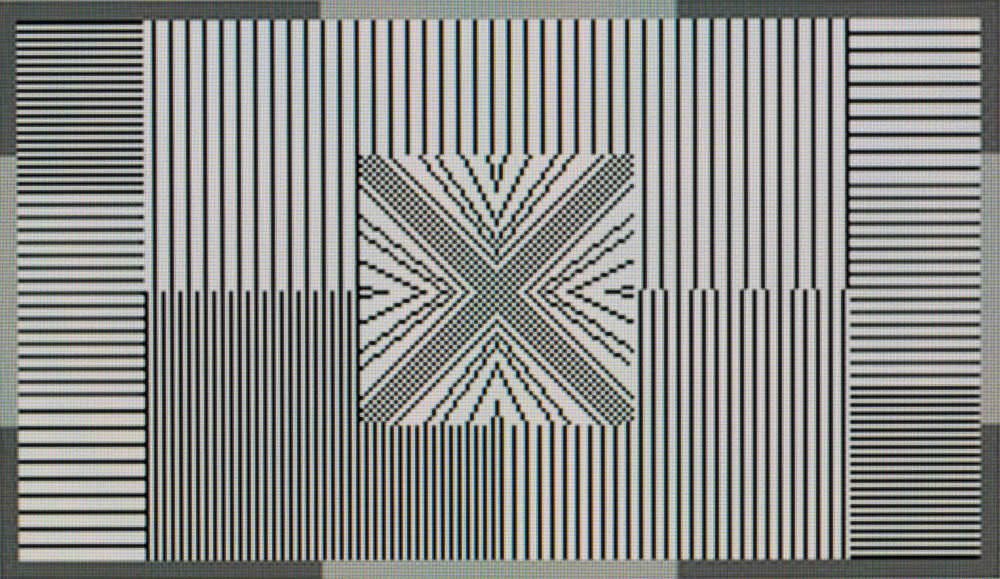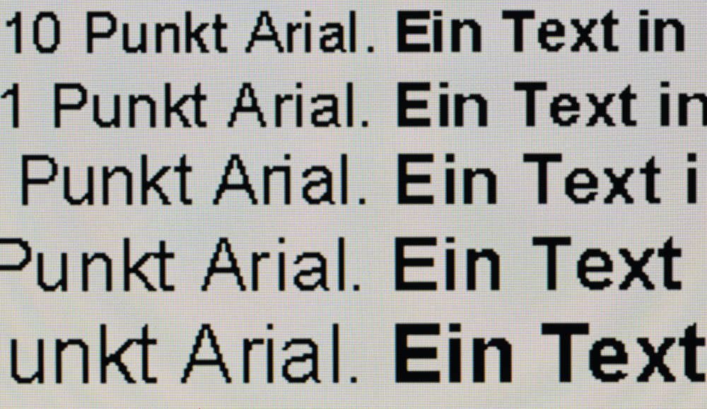 In der nativen Auflösung ist die Schärfe erwartungsgemäß sehr gut. Bei 1280 x 720 sieht man, dass die notwendige Pixelvergrößerung hauptsächlich durch zusätzlich eingefügte graue Bildpunkte bewirkt wird. Dies führt zu etwas fetteren Konturen mit leichtem Unschärfe-Eindruck. Farbsäume treten nicht auf.