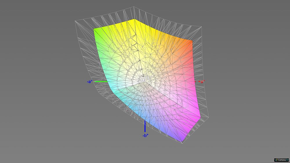 Die nachfolgenden Grafiken zeigen die Farbraumabdeckung zunächst nach der Software-Kalibration im Vergleich mit unterschiedlichen Arbeitsfarbräumen: