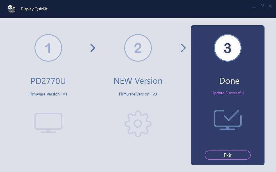 Für ein Firmware-Update muss bei BenQ leider erneut ein separates Tool installiert werden. Zuständig ist hierfür „Display QuicKit“. Wir haben die Aktualität der Firmware vor Testbeginn vorsorglich überprüft und mussten tatsächlich noch ein Update von Version 1 auf Version 3 durchführen.