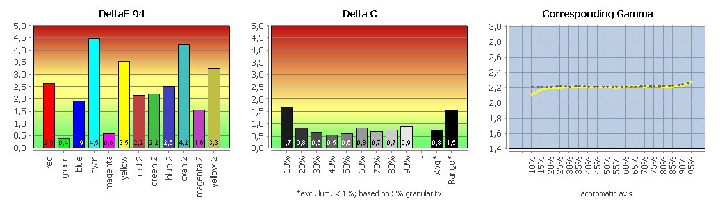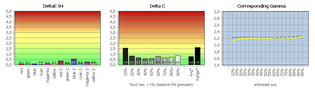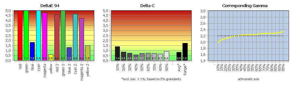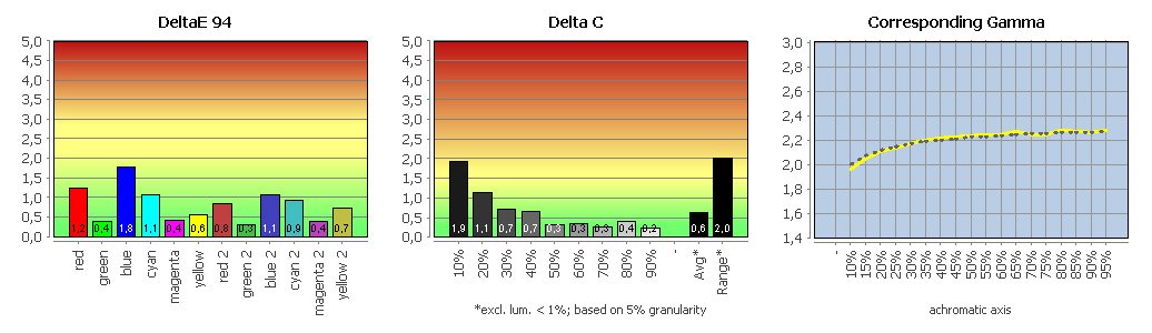 Der sRGB-Modus überzeugt. Die Graubalance ist weiterhin gut. Geringe Abweichungen in den bunten Farben zeugen von präzisen Farbraumtransformationen. Entsprechende Inhalte können damit bereits ohne weitere Maßnahmen sehr ansprechend auch in nicht Farbmanagement-fähigen Anwendungen wiedergegeben werden.
