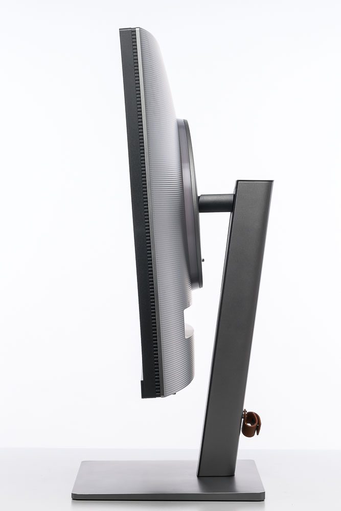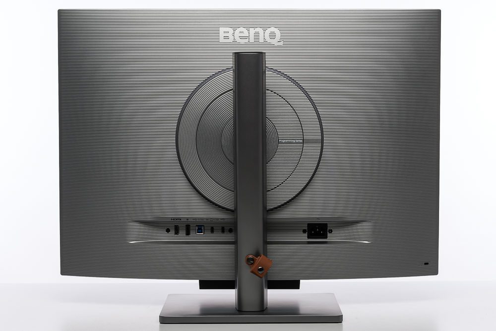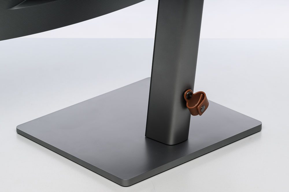 Die Kanten des eckigen Standbeins sind leicht abgerundet. Im unteren Bereich ist eine braune Kunststoffschlaufe mit Druckknopfverschluss zum Bündeln der Kabel angebracht. Funktional kann die Lösung durchaus überzeugen. Warum BenQ dabei einen farbigen Akzent setzt, bleibt ein Rätsel, denn sie wirkt optisch so oder so eher aufgepfropft.
