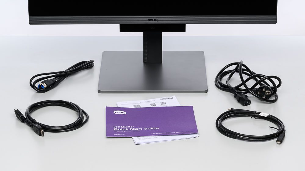 Der Lieferumfang des BenQ RD280U umfasst neben einer Schnellstartanleitung und dem obligatorischen Stromkabel auch Kabel für USB-C und HDMI sowie den zweiten USB-Upstream (Typ B). Ein Display-Port-Kabel ist nicht enthalten.